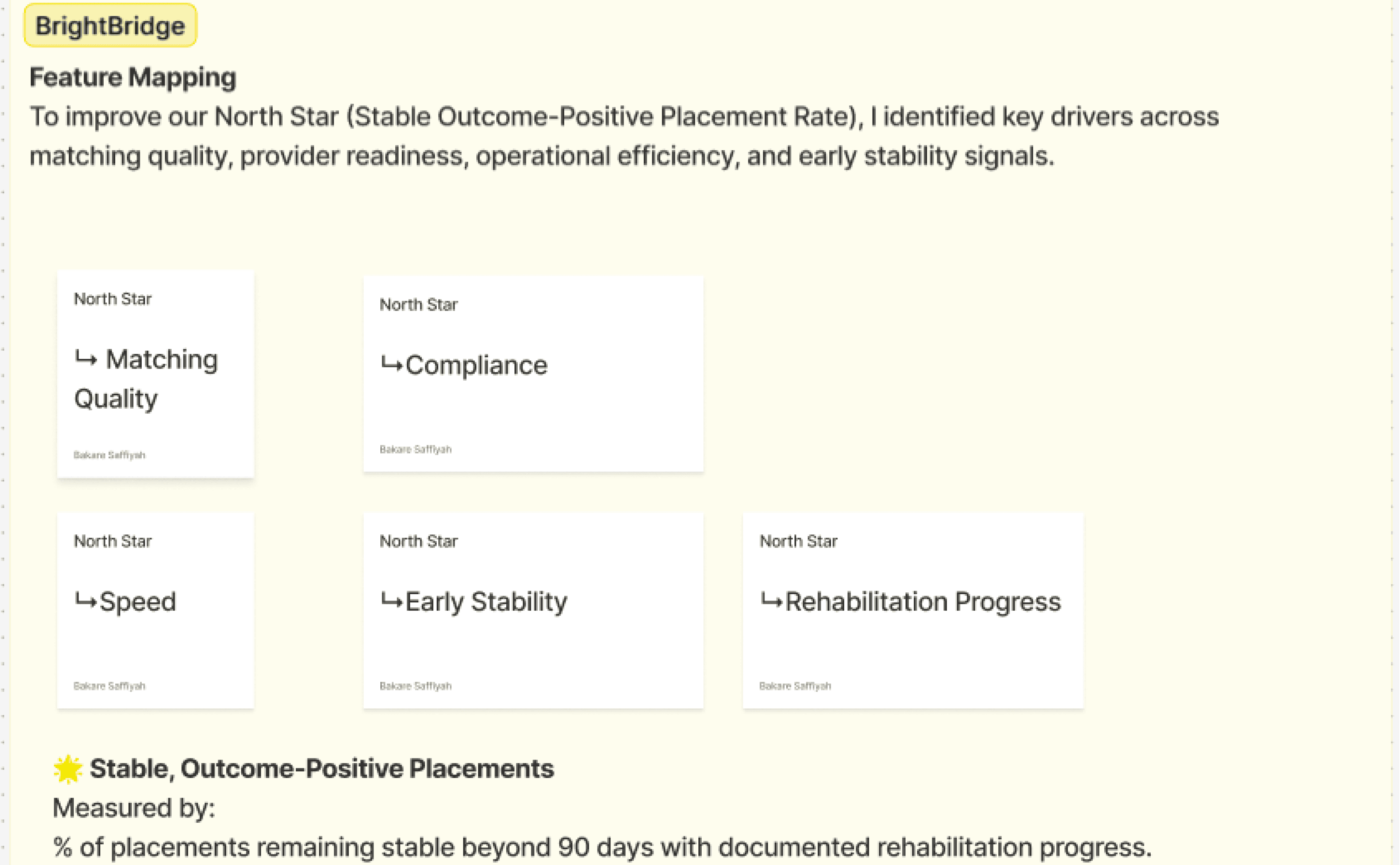 Before designing solutions, we defined our one major North Star: Stable Outcome-Positive Placement Rate. Every feature and supporting metric was mapped to this outcome. Features include:
